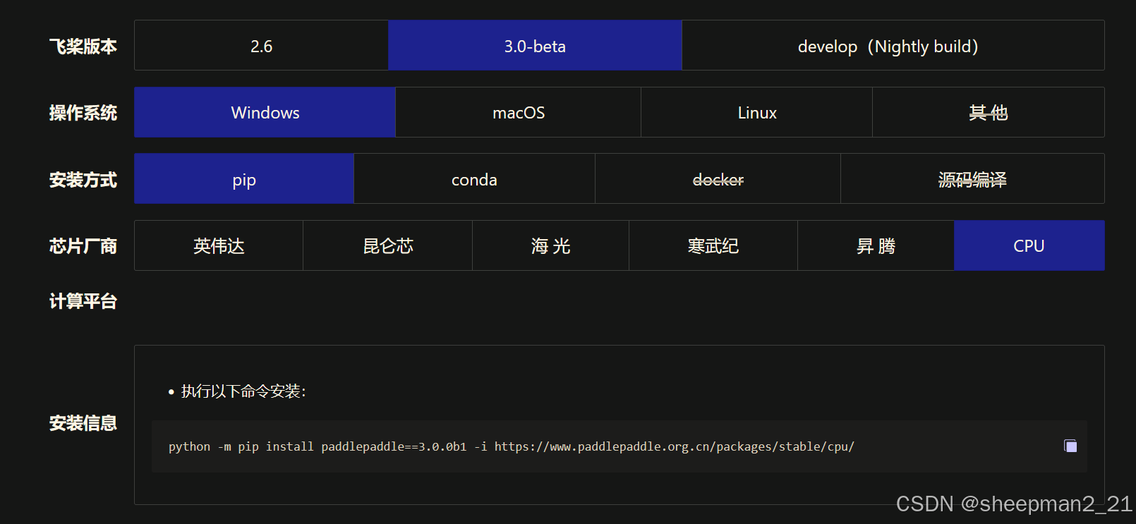 注意:paddleocr还需要下载依赖库paddlepaddle-gpu(cpu版本也可以但是代码内要注意使用cpu)。下载gpu版本需要在paddlepaddle官网选择相应的版本进行下载,选择完成后会产生pip下载指令如下图所示。