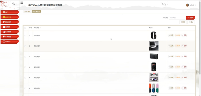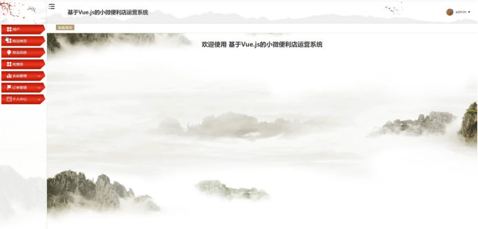 管理员进入主页面,主要功能包括对用户、商品类型、商品信息、优惠券、系统管理、订单管理、个人中心等进行操作。如图5-9所示:
