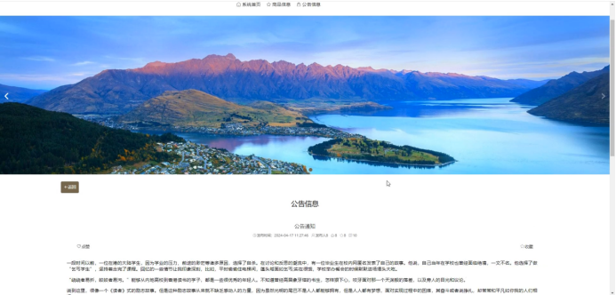 公告信息:在公告信息页面的输入栏中输入标题进行查询,可以查看到公告信息详细信息,并根据需要进行点赞或收藏操作;公告信息页面如图5-4所示: