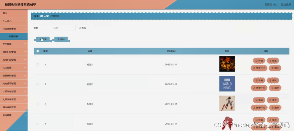 校园信息管理,在校园信息管理页面可以对索引、标题、发布时间、封面等内容进行详情,修改,查看评论或删除操作,如图4-11所示。