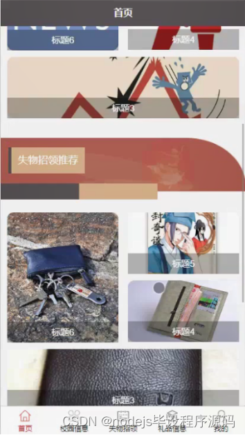 校园失物招领系统APP,在系统首页可以查看首页、校园信息、失物招领、礼品信息、我的等内容,并进行详细操作;如图4-3所示。