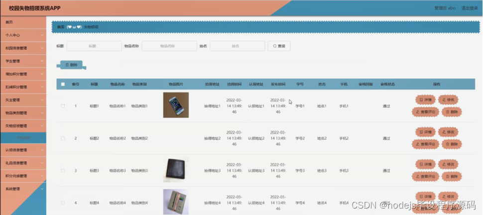 失物招领管理,在失物招领管理页面可以对索引、标题、物品名称、物品类别、物品图片、拾得地址、拾得时间、认领地址、发布时间、学号、姓名、手机、审核回复、审核状态等内容进行详情,修改,查看评论和删除操作,如图4-16所示。
