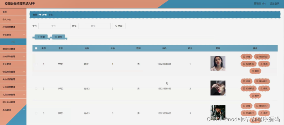 学生管理,在学生管理页面可以对索引、学号、姓名、年龄、性别、手机、积分、照片等内容进行详情,增加积分,扣减积分,修改和删除操作,如图4-12所示。