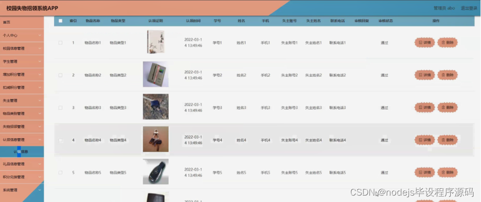 认领信息管理,在认领信息管理页面可以对索引、物品名称、物品类型、认领证明、认领时间、学号、姓名、手机、失主账号、失主姓名、联系电话、审核回复、审核状态等内容进行详情或删除操作,如图4-17所示。