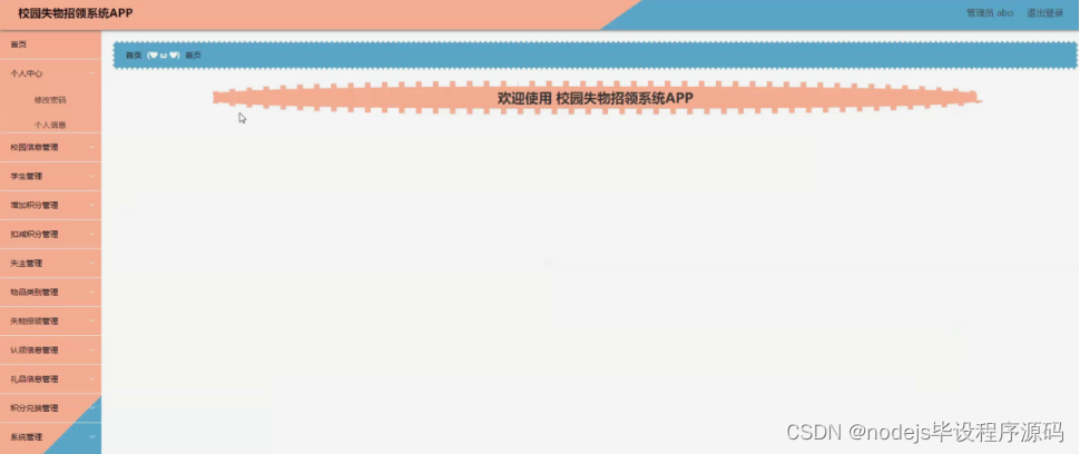 管理员登录系统后,可以对首页、个人中心、校园信息管理、学生管理、增加积分管理、扣减积分管理、失主管理、物品类别管理、失物招领管理、认领信息管理、礼品信息管理、积分兑换管理、系统管理等功能进行相应的操作管理,如图4-10所示。