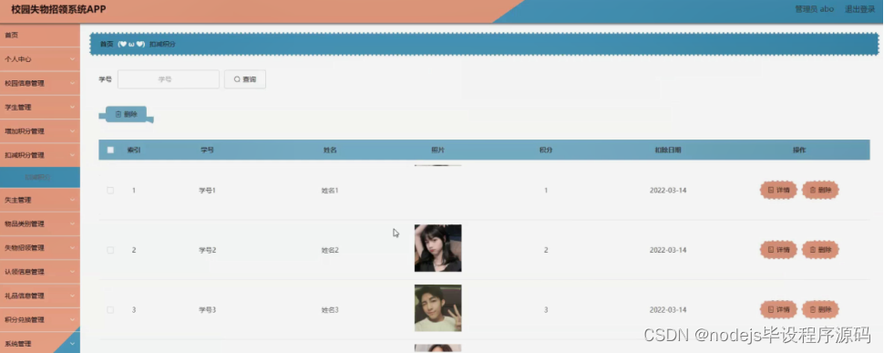 扣减积分管理,在扣减积分管理页面可以对索引、学号、姓名、照片、积分、扣除日期等信息进行详情或删除操作,如图4-14所示。