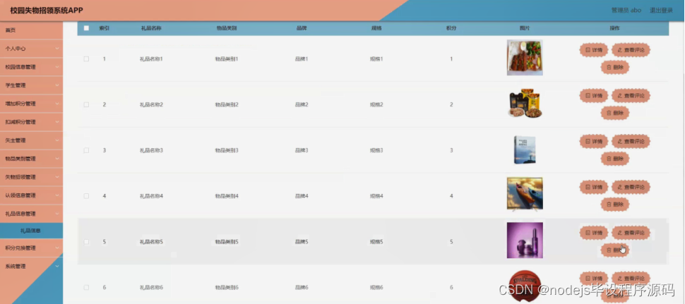 礼品信息管理,在礼品信息管理页面可以对索引、礼品名称、物品类别、品牌、规格、积分、图片等内容进行详情,查看评论和删除操作,如图4-18所示。