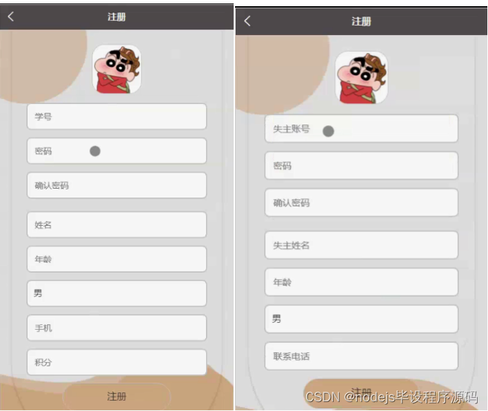 学生和失主注册,在用户注册页面,学生和失主通过填写用户注册信息进行注册操作,如图4-2所示。
