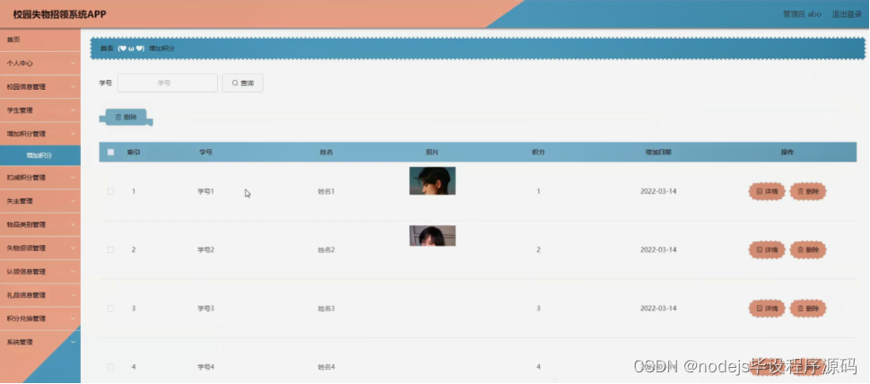 增加积分管理,在增加积分管理页面可以对索引、学号、姓名、照片、积分、增加日期等信息进行详情或删除操作,如图4-13所示。