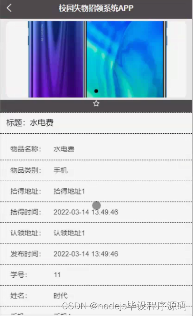 失物招领,在失物招领页面可以查看标题、物品名称、物品类别、拾得地址、拾得时间、认领地址、发布时间、学号、姓名、手机、物品描述、审核回复等内容,并根据需要进行评论或收藏等操作,如图4-5所示。