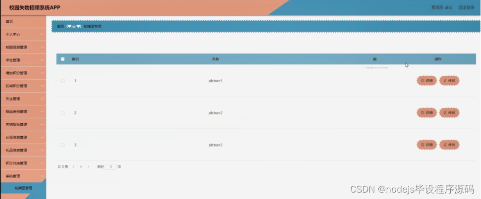 系统管理,在轮播图管理页面可以对索引、名称、值等内容进行详情或修改操作;如图4-20所示。