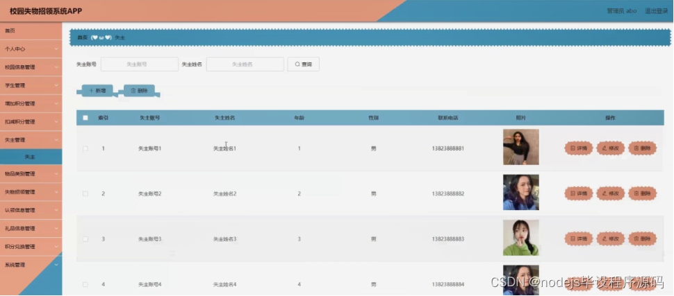 失主管理,在失主管理页面可以对索引、失主账号、失主姓名、年龄、性别、联系电话、照片等内容进行详情,修改和删除操作,如图4-15所示。
