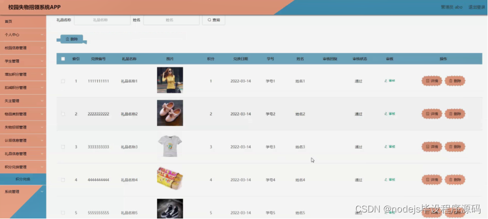 积分兑换管理,在积分兑换管理页面可以对过些、兑换编号、礼品名称、图片、积分、兑换日期、学号、姓名、审核回复、审核状态、审核等内容进行详情或删除操作,如图4-19所示。