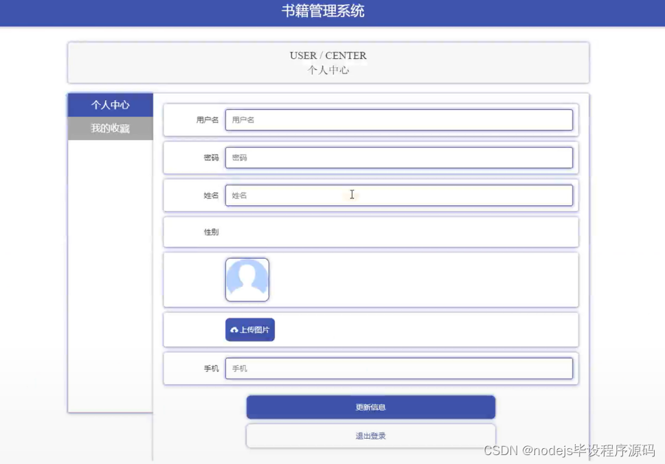 个人中心,在个人中心页面通过填写用户名,密码,姓名,性别,上传图片,手机等内容进行更新信息,根据需要对我的收藏进行详细操作,如图5-4所示。