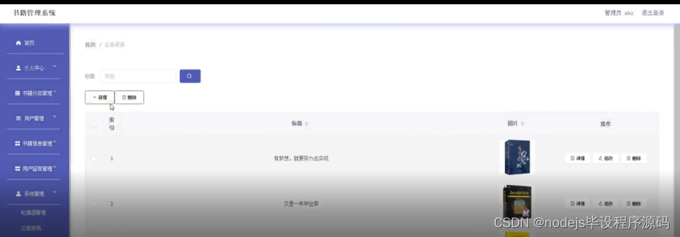 系统管理,在公告资讯页面可以对索引,标题,图片等内容进行详情,修改和删除等操作,还可对轮播图管理进行相应操作,如图5-11所示。