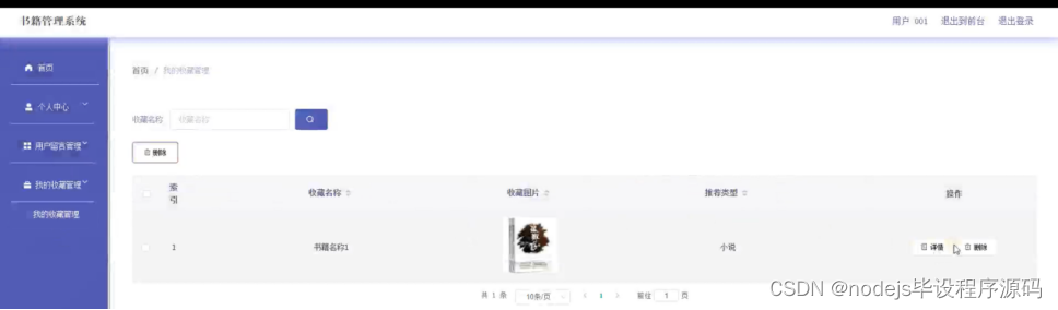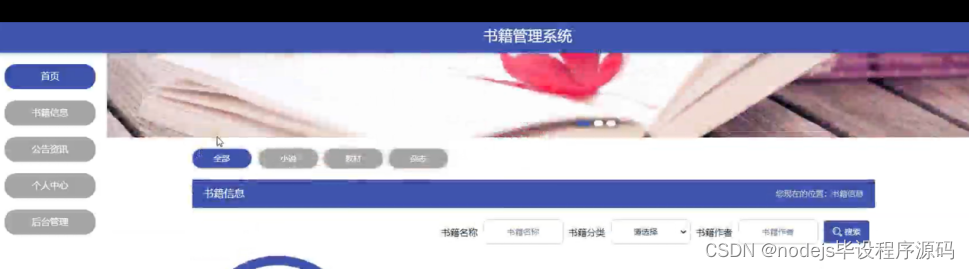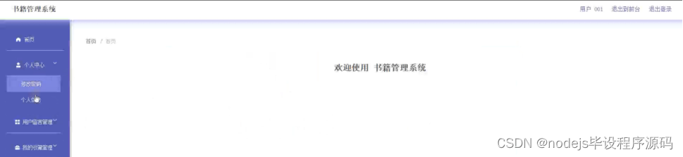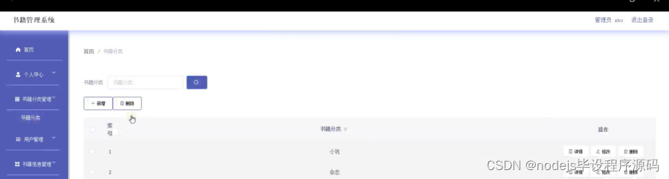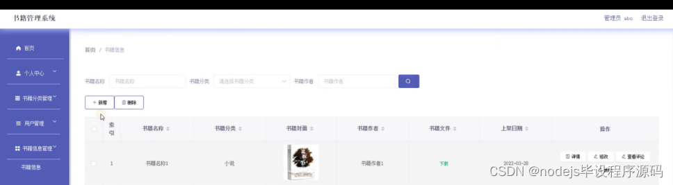 该文章描述了一个基于Node.js(使用Express框架)、Vue.js前端的书籍管理系统。系统包括用户注册、书籍信息展示、个人中心管理等功能,并提供管理员权限进行分类、用户和书籍信息的管理。此外,还涉及了MySQL数据库的使用以及系统的调试和部署。