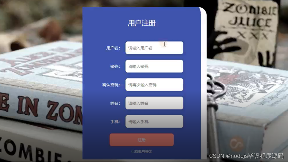 用户注册,在用户注册页面通过填写用户名,密码,确认密码,姓名,手机等内容完成用户注册,如图5-2所示。