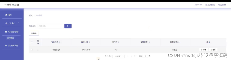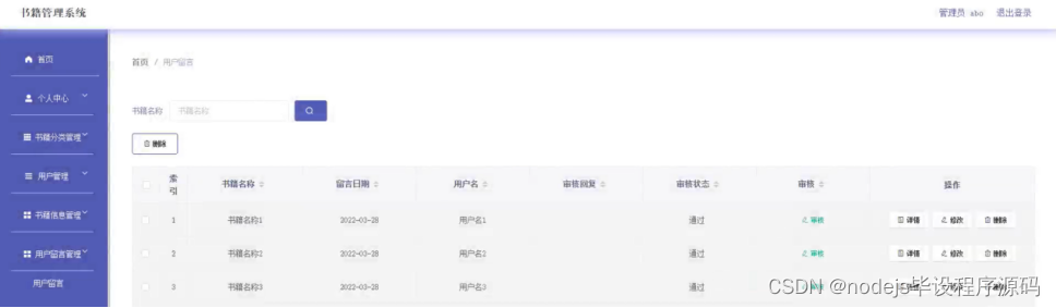用户留言管理,在用户留言页面可以对索引,书籍名称,留言日期,用户名,审核回复,审核状态,审核等内容进行详情和删除等操作,如图5-13所示。