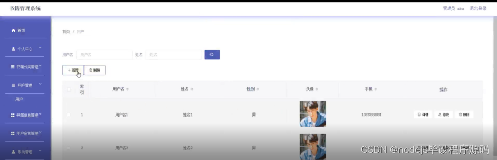 用户管理,在用户管理页面可以对索引,用户名,姓名,性别,头像,手机等内容进行详情,修改和删除等操作,如图5-8所示。