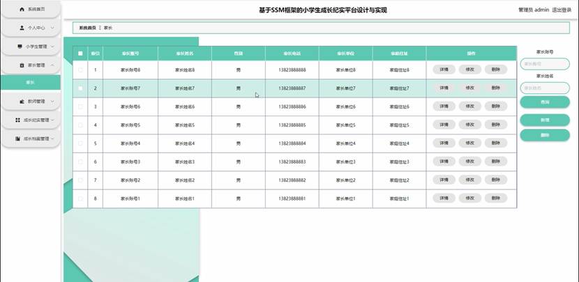 管理员点击家长管理。进入家长页面输入家长账号和家长姓名进行查询,新增或删除家长列表,并根据需要对家长详细信息进行详情,修改或删除操作。如图5-3所示: