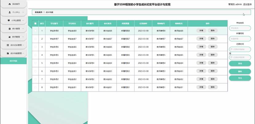 管理员点击成长档案管理。进入成长档案页面输入学生姓名,所属班级和记录时间进行查询,删除或导出成长档案列表,并根据需要对成长档案详细信息进行详情或删除操作。如图5-6所示: