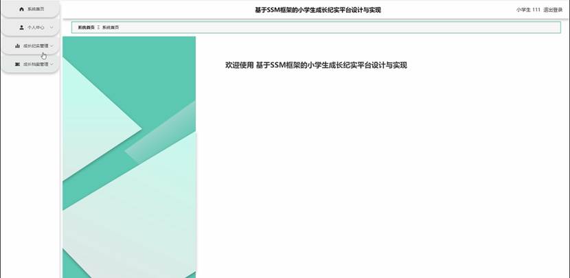 小学生进入主页面,主要功能包括对系统首页,个人中心,成长纪实管理,成长档案管理等进行操作。小学生主页面如图5-8所示: