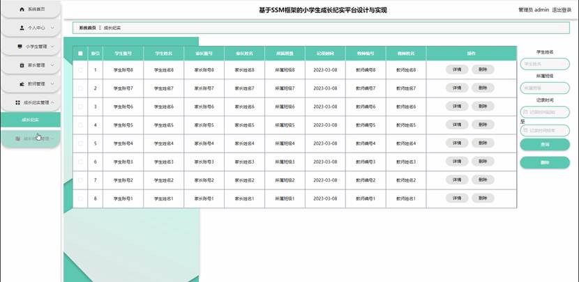 管理员点击成长纪实管理。进入成长纪实页面输入学生姓名,所属班级和记录时间进行查询或删除成长纪实列表,并根据需要对成长纪实详细信息进行详情或删除操作。如图5-5所示: