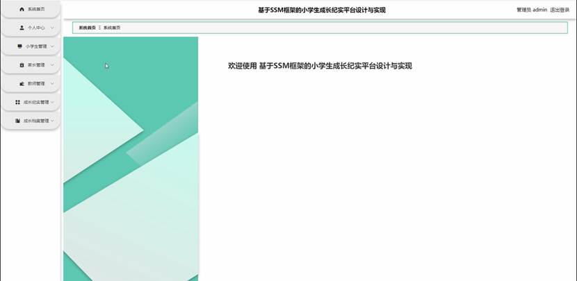 管理员进入主页面,主要功能包括对系统首页,个人中心,小学生管理,家长管理,教师管理,成长纪实管理,成长档案管理等进行操作。管理员主页面如图5-1所示: