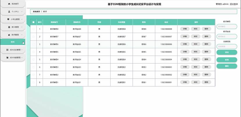 管理员点击教师管理。进入教师页面输入教师编号,教师姓名和负责班级进行查询,新增或删除教师列表,并根据需要对教师详细信息进行详情,修改或删除操作。如图5-4所示: