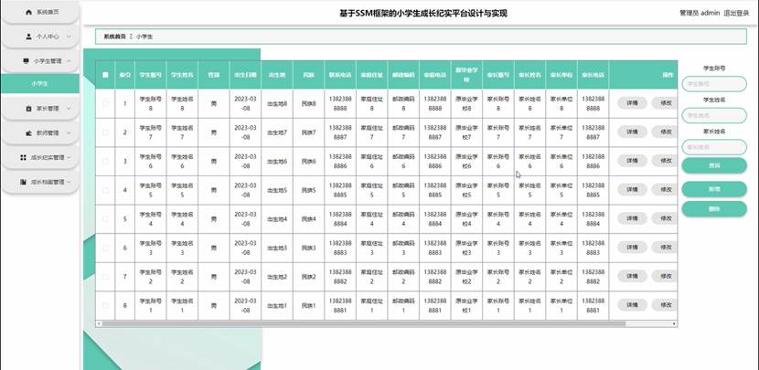 该系统采用 Java 语言开发,基于 SSM 框架搭建,搭配 MySQL 数据库存储数据,采用 B/S 架构确保多设备访问。核心功能涵盖多个模块:登录注册模块,管理员凭专属账号登录后台,小学生(凭学生账号)、家长(凭家长账号)、教师(凭教师编号)分别凭账号(绑定姓名、联系方式等)注册与登录;个人中心模块,四类角色均可更新个人信息(密码、联系方式),维护账号安全;小学生管理模块,管理员可查询、新增、修改、删除小学生信息(学生账号、姓名、性别、出生日期、家庭住址、家长信息等),建立学生基础档案;家长管理模块,管理员可维护家长信息(家长账号、姓名、电话、单位、家庭住址),关联学生账号;教师管理模块,管理员可管理教师信息(教师编号、姓名、负责班级、职务、电话),分配教学管理权限;成长纪实管理模块,教师可录入学生成长纪实(学生账号、所属班级、记录时间、身心健康、学业成绩、个性技能、成长体验),小学生和家长可查看个人 / 子女成长纪实,管理员可查看所有纪实记录;成长档案管理模块,教师可完善学生成长档案(学习情况、获奖情况、志愿活动),管理员可查询、导出所有学生档案,家长和小学生可查看个人 / 子女档案详情。这些功能覆盖了小学生从基础信息录入到成长记录跟踪的全流程,同时打通管理员、教师、家长、学生四方协同通道,既满足校园高效管理需求,也实现家校实时联动,助力小学生成长过程的全面记录与跟踪。