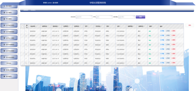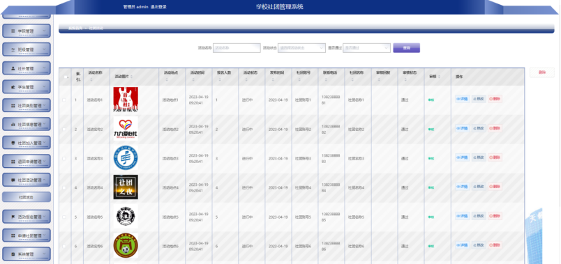 管理员点击社团活动管理。进入社团活动页面输入活动名称、选择活动状态和是否通过可以查询或删除社团活动列表,并根据需要对社团活动详细信息进行详情,修改和删除等操作。如图5-9所示: