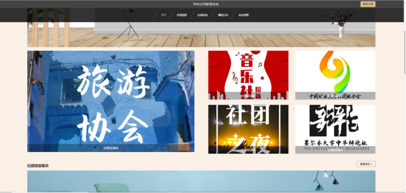 当人们打开系统的网址后,首先看到的就是首页界面。在这里,人们能够看到学校社团管理系统的导航条。系统首页界面如图5-1所示: