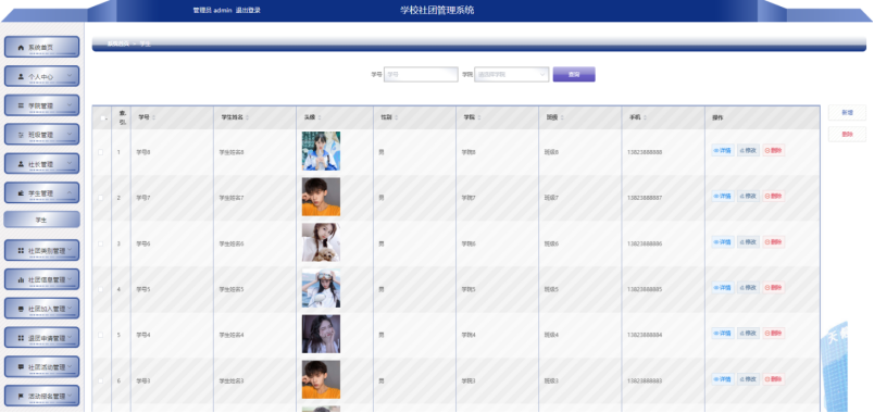 管理员进入主页面,主要功能包括对系统首页,个人中心,学院管理,班级管理,社长管理,学生管理,社团类别管理,社团信息管理,社团加入管理,退团申请管理,社团活动管理,活动报名管理,申请社团管理,系统管理等进行操作。管理员主页面如图5-6所示: