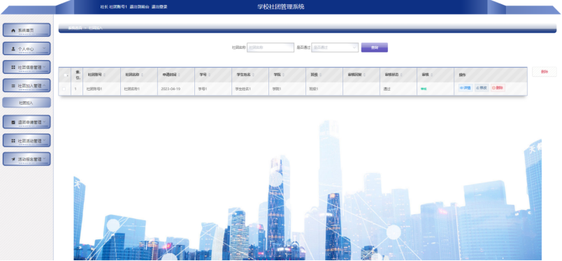社长点击社团加入管理。进入社团加入页面输入社团名称和选择是否通过可以查询或删除社团加入列表,并根据需要对社团加入详细信息进行详情,修改和删除等操作。如图5-13所示: