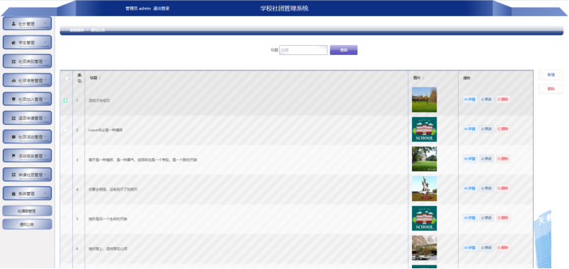 管理员点击系统管理。进入通知公告页面输入标题可以查询,新增或删除通知公告列表,并根据需要对通知公告详细信息进行详情,修改和删除操作,还可以对轮播图管理进行详细操作;如图5-11所示: