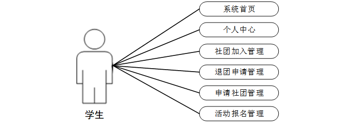 学生进入系统可以对系统首页,个人中心,社团加入管理,退团申请管理,申请社团管理,活动报名管理进行管理。学生用例如图3-5所示。