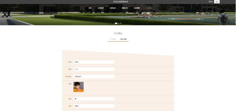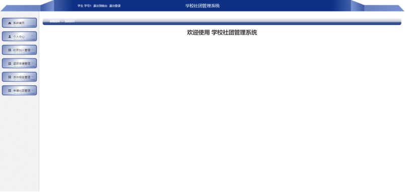 学生主要包括对系统首页,个人中心,社团加入管理,退团申请管理,活动报名管理,申请社团管理等功能进行详细操作。学生主页面如图5-14所示: