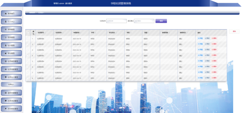 管理员点击社团加入管理。进入社团加入页面输入社团名称和选择是否通过可以查询或删除社团加入列表,并根据需要对社团加入详细信息进行详情,修改和删除等操作。如图5-8所示: