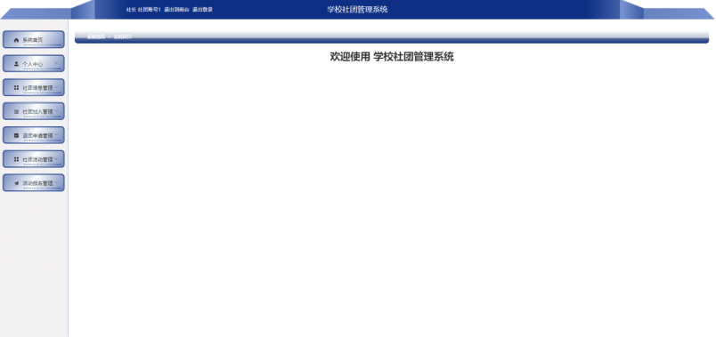 社长主要包括对系统首页,个人中心,社团信息管理,社团加入管理,退团申请管理,社团活动管理,活动报名管理等功能进行操作。社长主页面如图5-12所示: