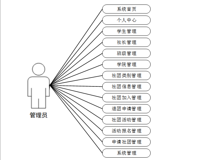 学生社团管理系统的最大权限用户是管理员,通过管理员菜单中的系统首页,个人中心,学院管理,班级管理,社长管理,学生管理,社团类别管理,社团信息管理,社团加入管理,退团申请管理,社团活动管理,活动报名管理,申请社团管理,系统管理等选项来对系统后台信息进行管理。管理员用例如图3-3所示。