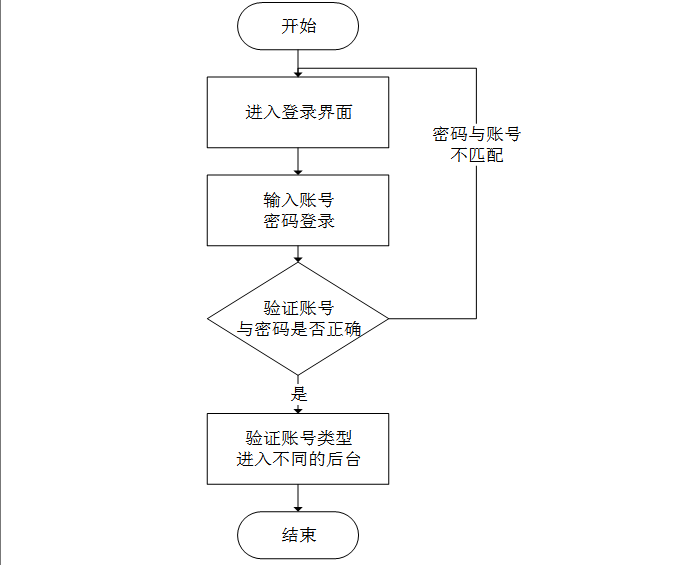登录流程是该系统的第一个流程,登录的第一步是输入账号、密码登录,系统会验证账号与密码是否正确,正确时系统会判断账号类型再进入不同的后台;不正确时,会返回到登录的第一步,输入用户重新执行登录流程。该流程如图3-1所示。