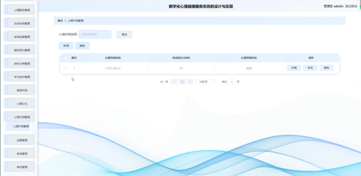 管理员点击心理评测管理。在心理评测管理页面输入心理评测名称可以查询、新增或删除心理评测列表,并根据需要对心理评测细信息进行详情、修改或删除操作;如图5-12所示: