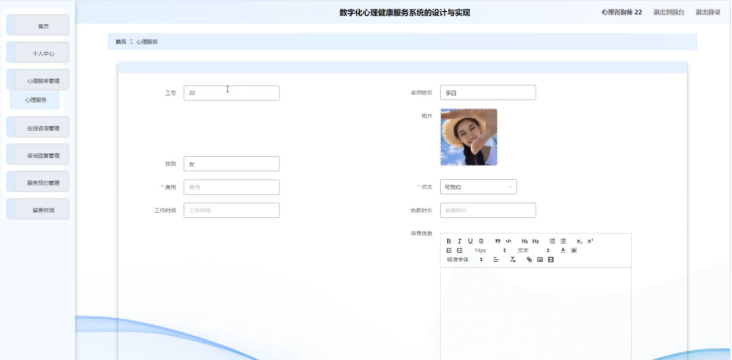 心理咨询师点击心理服务管理。在心理服务管理页面可对个人工号、费用、工作时间、荣誉信息、预约状态等进行编辑。如图5-15所示: