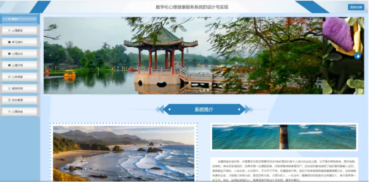 当人们打开系统后,首先看到的就是首页界面。在这里,人们能够看到数字化心理健康服务系统的导航条和系统简介等。系统首页界面如图5-1所示: