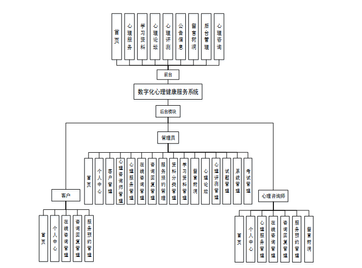 数字化心理健康服务系统的设计与实现,最主要的是满足使用者的使用需求,并且可以向使用者提供一些与系统配套的服务。本篇论文主要从实际出发,采用以对象为设计重点的设计方法,因此在进行系统总体的需求分时借助用例图可以更好的阐述各个功能模块之间的关系,以及明确系统使用者之间的联系。本系统的设计包含管理员,心理咨询师和客户三个角色。