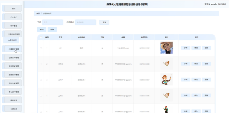 管理员点击心理咨询师管理。进入心理咨询师管理页面输入老师工号和姓名进行查询、修改或删除心理咨询师管理列表,并根据需要对心理咨询师信息进行详情、修改、删除操作。如图5-9所示: