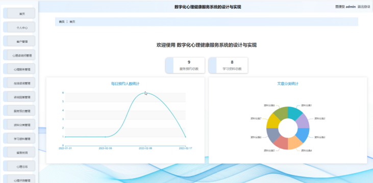 系统管理:管理员可以对用户、心理咨询师、心理服务、评测工具等进行管理,同时支持系统公告、轮播图等模块的编辑。