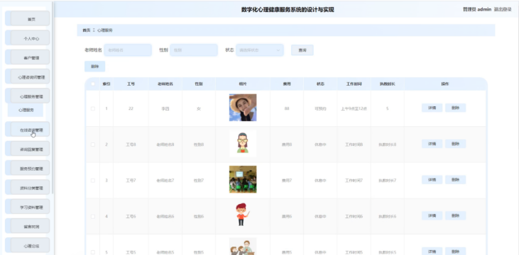 管理员点击心理服务管理。在心理服务管理页面输入老师姓名、性别、状态等对心理服务列表进行查询、删除等操作,并根据需要对心理服务详细信息进行详情或删除操作。如图5-10所示: