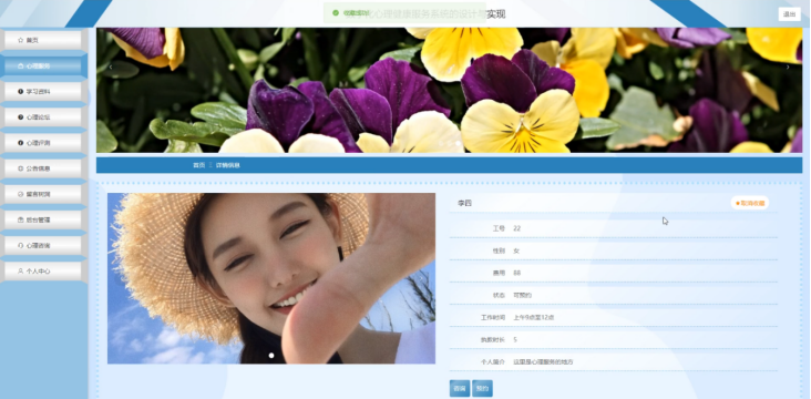 心理服务:在心理服务页面可以查看心理咨询师详细信息,并根据需要选择收藏、咨询、预约心理咨询师;心理服务页面如图5-3所示: