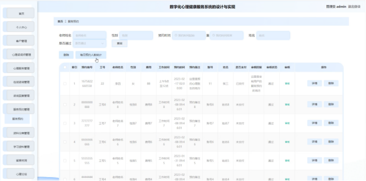 管理员点击服务预约管理。在服务预约管理页面老师姓名、性别、预约时间、审核状态和客户姓名进行查询或删除服务预约信息列表,查看每日预约人数统计,并根据需要对服务预约信息进行详情或删除操作。如图5-11所示: